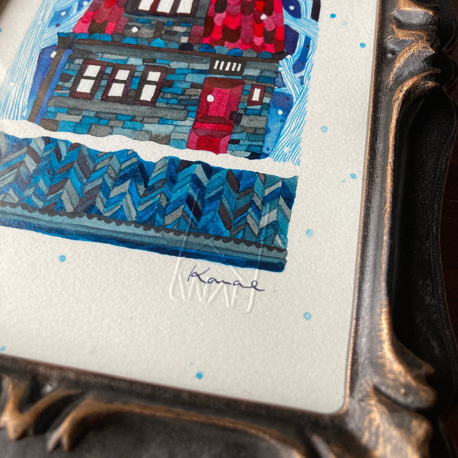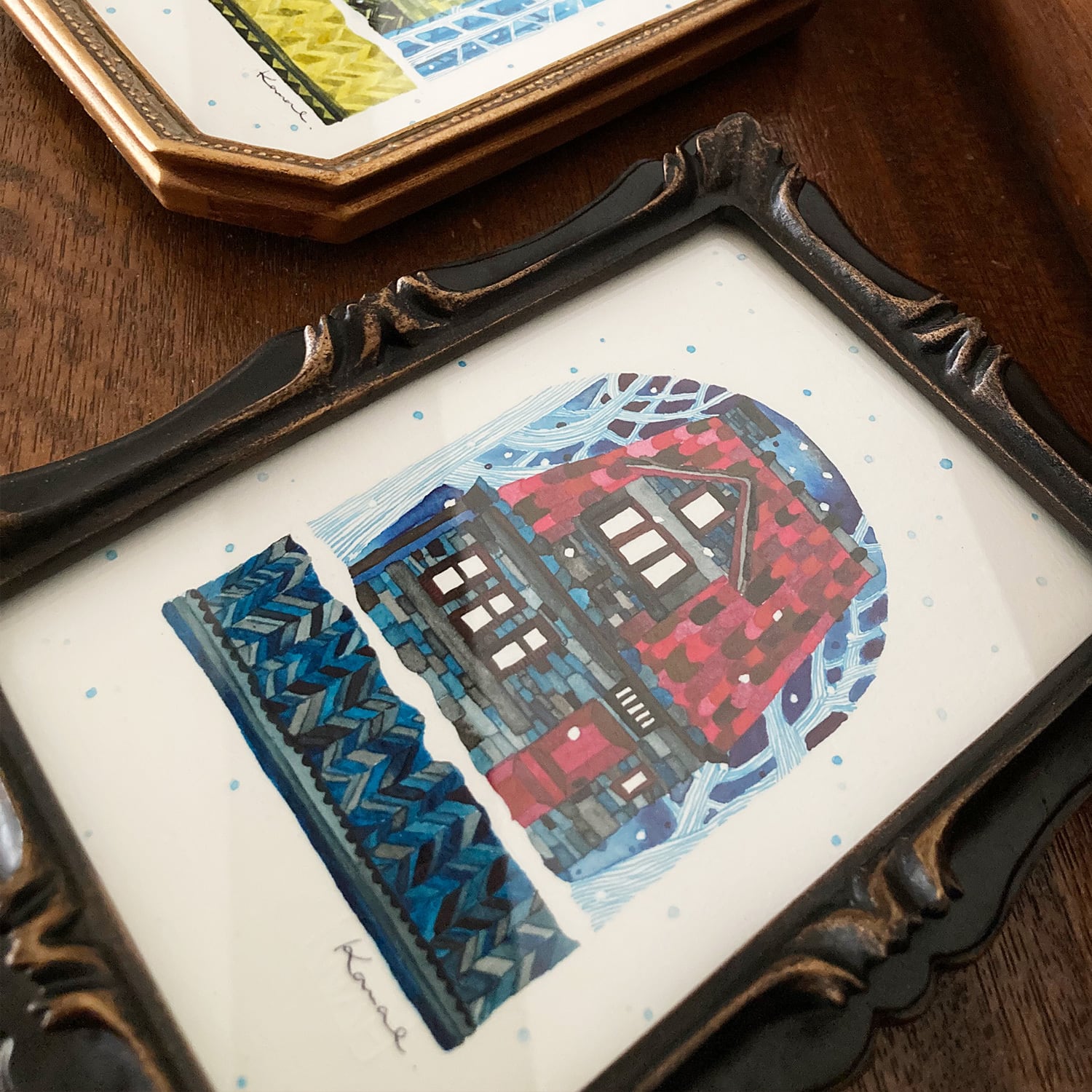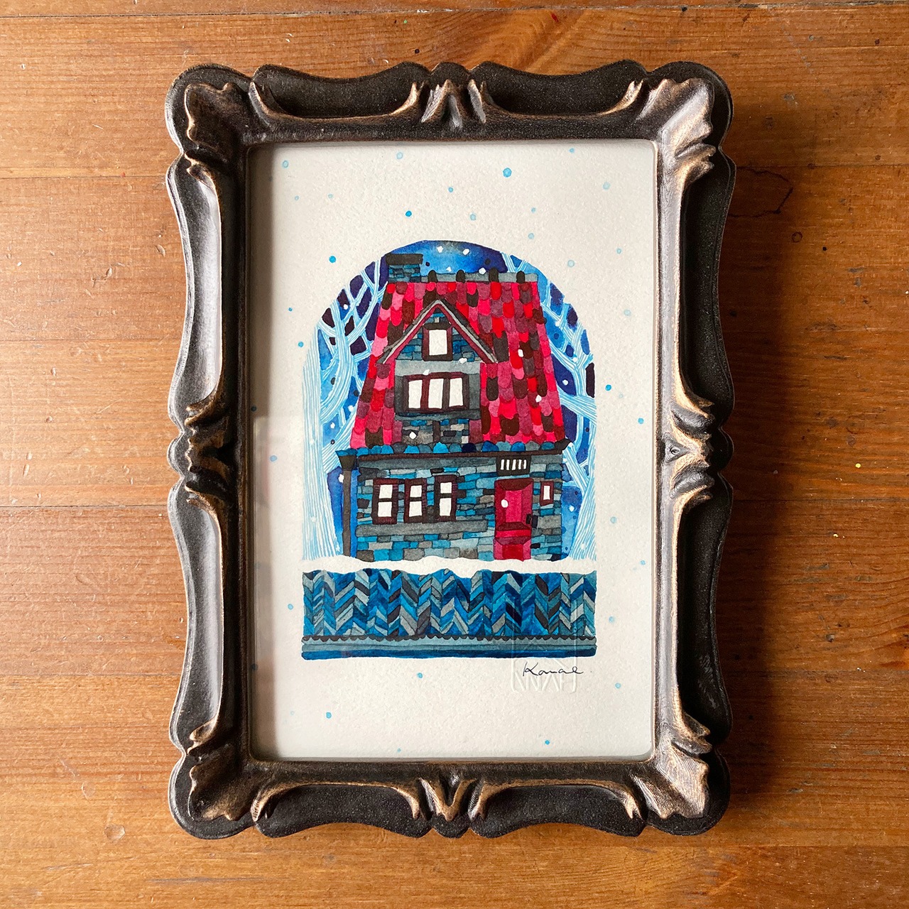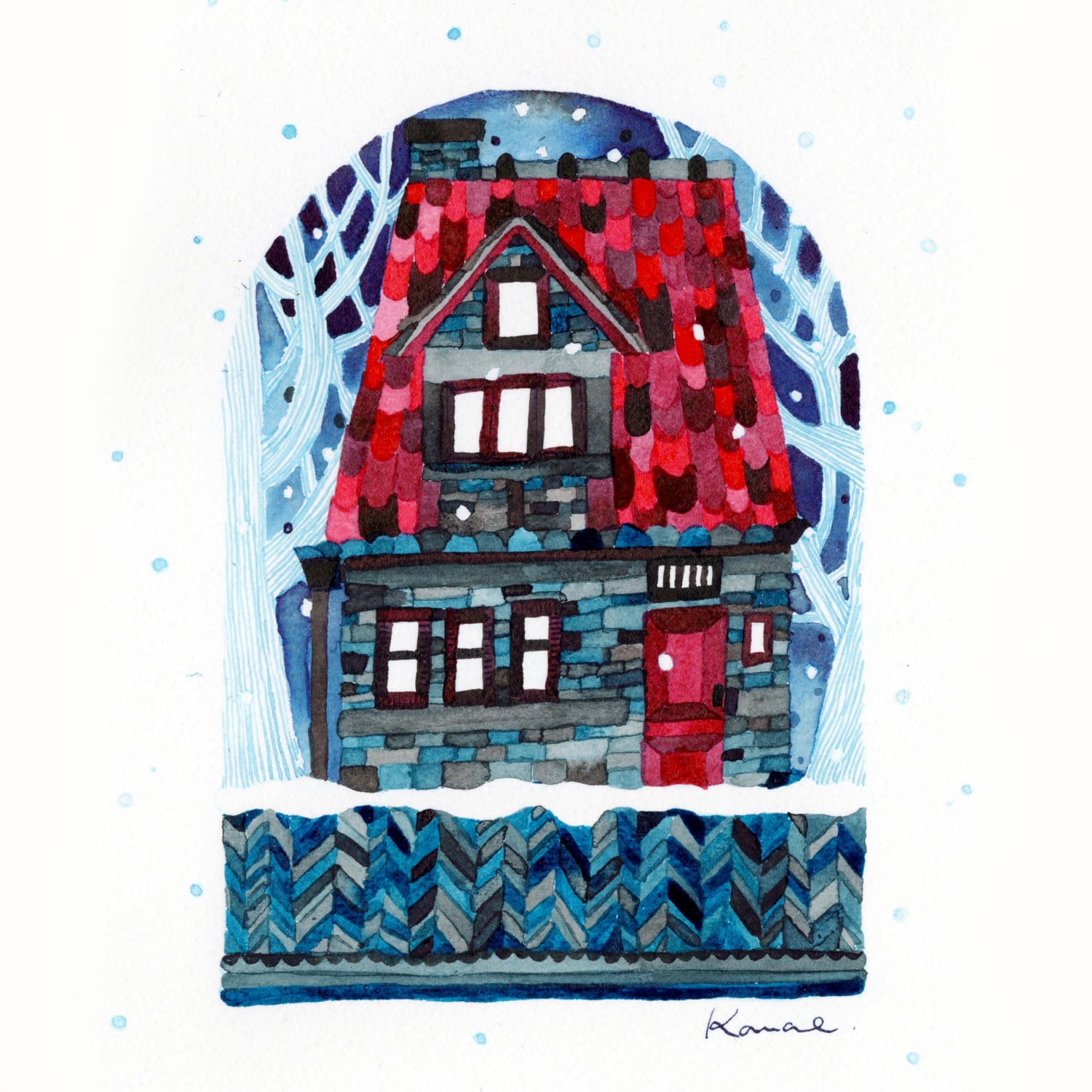 赤い屋根の家が冬の静けさの中、柔らかな白い雪に包まれています。